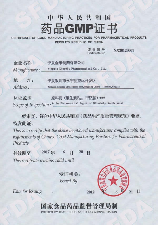 寧夏金維制藥有限公司成立于2010年7月,位于寧夏銀川市望遠經(jīng)濟開發(fā)區(qū),是一家專業(yè)生產(chǎn)維生素系列原料藥產(chǎn)品的企業(yè),主要生產(chǎn)維生素B12、氰鈷胺、甲鈷胺、腺苷鈷胺、維生素B12飼料添加劑等維生素系列產(chǎn)品。我公司自成立以來,嚴格按照《藥品生產(chǎn)質(zhì)量管理規(guī)范(2010年修訂)》的有關(guān)規(guī)定,通過組織人員培訓、修訂和完善文件資料等不斷夯實軟件基礎(chǔ)工作,并對廠房和生產(chǎn)設(shè)施等硬件方面進行改造,逐步建立健全和完善了質(zhì)量管理體系,使我公司的質(zhì)量管理工作實現(xiàn)了規(guī)范化和正規(guī)化管理。經(jīng)我公司申請,寧夏回族自治區(qū)食品藥品監(jiān)督管理局GMP現(xiàn)場檢查驗收專家組根據(jù)《藥品生產(chǎn)質(zhì)量管理規(guī)范(2010年修訂)》的規(guī)定,于2012年4月17日至4月20日對我公司生產(chǎn)的原料藥(維生素B12、甲鈷胺)進行現(xiàn)場檢查和審核,經(jīng)專家組綜合評定我公司符合相關(guān)規(guī)定并于2012年06月20日頒發(fā)了《藥品GMP證書》。認證范圍為原料藥(維生素B12、甲鈷胺),證書編號為NX20120001,目前我公司為寧夏回族自治區(qū)首家通過新版藥品GMP認證的企業(yè)。